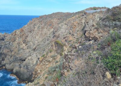 Al observar hacia el oeste del camino, se pueden distinguir pequeñas ondulaciones en el terreno que corresponden a las conocidas «ondas de empuje» (Socorro, 2015) en geología volcánica. Estas ondulaciones tienen su origen en las últimas coladas volcánicas ocurridas hace aproximadamente 6.000 años. Se forman en coladas de lavas muy viscosas como estas: en el interior de la colada, la lava viscosa sigue teniendo capacidad de empuje, pero la cabecera frontal de la colada tiene dificultades para seguir avanzando. Mientras tanto, en la superficie, la corteza exterior de la lava se enfría progresivamente hasta solidificarse, creando así ese peculiar relieve ondulado.