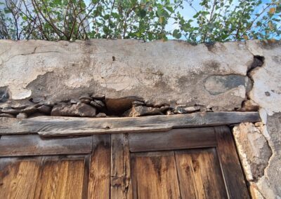 Cuenta con zócalo y cornisa sencilla de cantería.